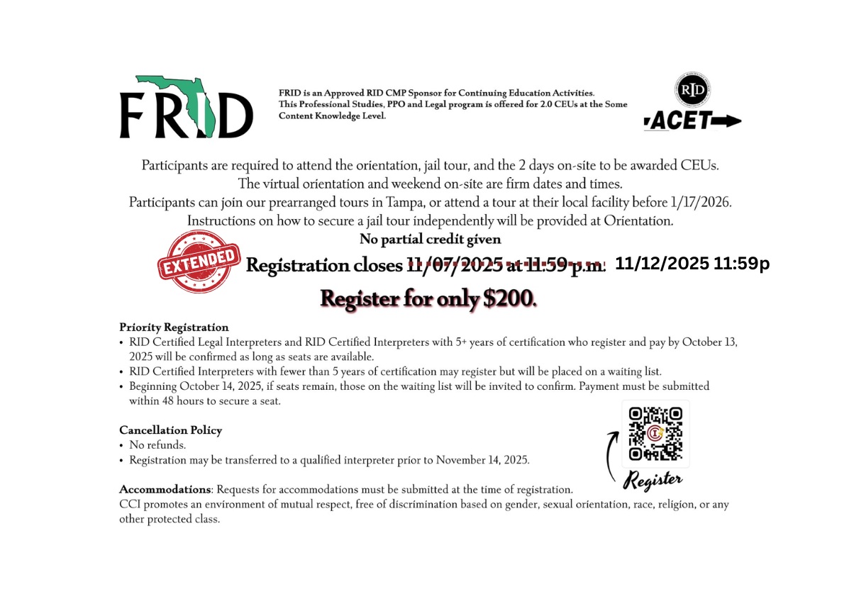 Residency: Must reside in Florida | Credentials: RID Certification, 5 years prioritized